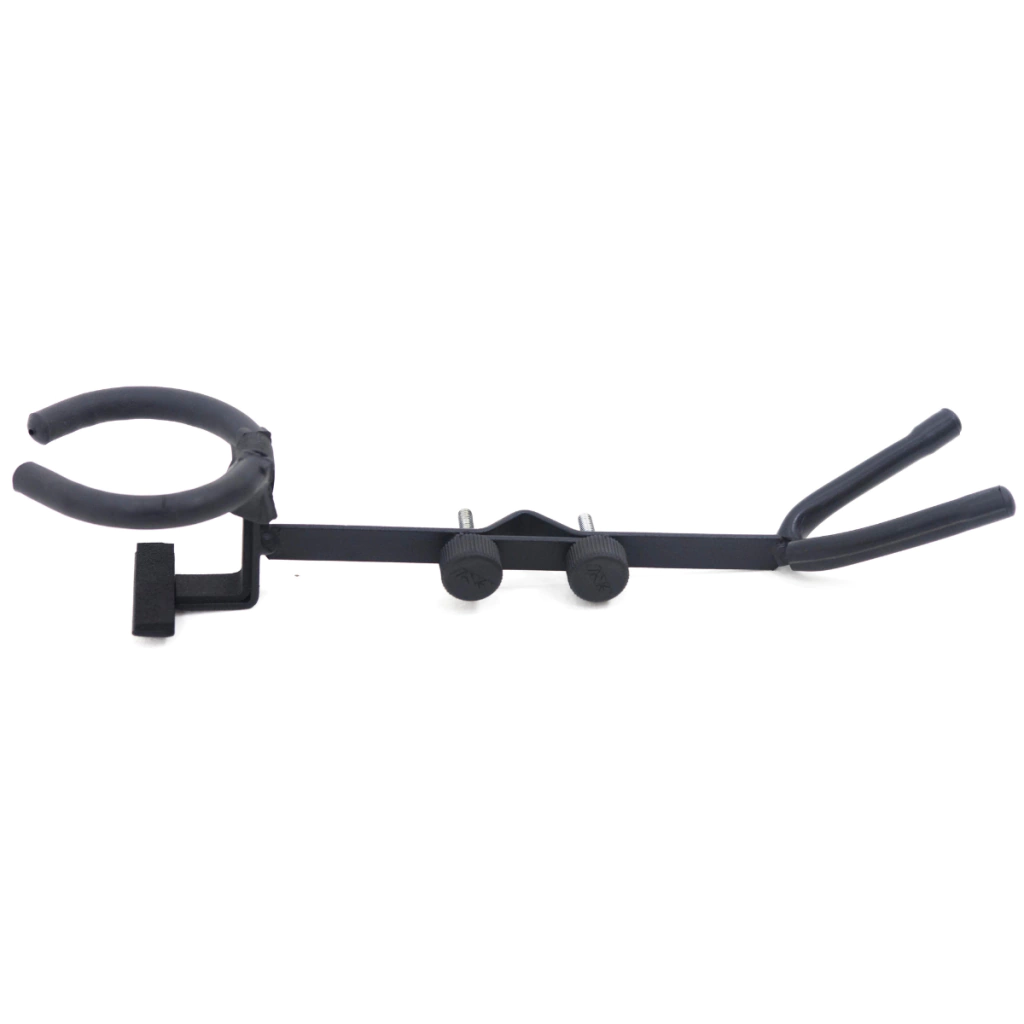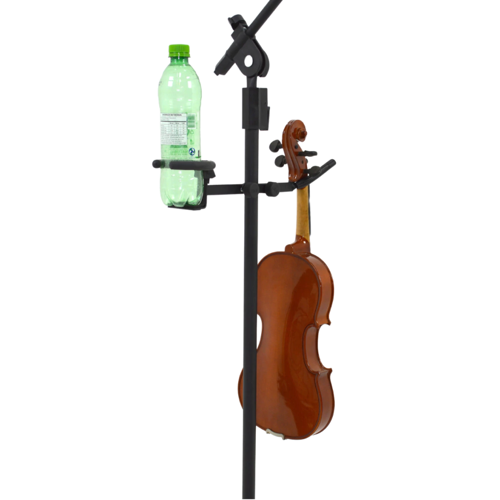 Clamp multifuncional duplo, descanso para cavaquinho, ukulele ou violino e apoio para copo, latinha ou garrafa, utilizado em suportes ou pedestais.