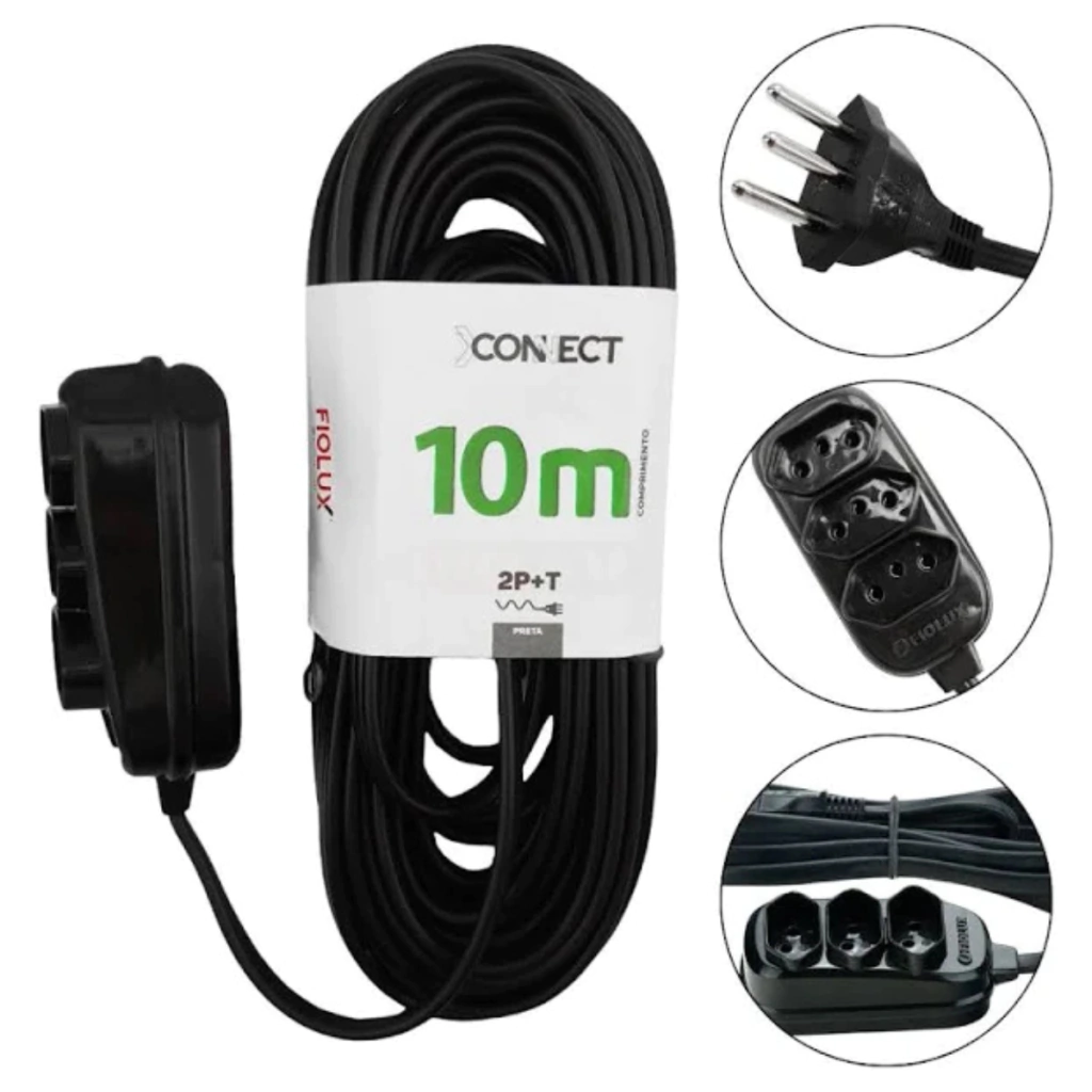Extensão 3 Tomadas 2P+T 10m Connect Preta Reforçada Fiolux
