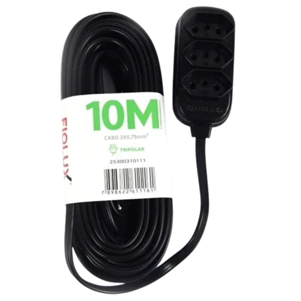 A Extensão Connect 3T da Fiolux possui um cabo de 10 metros de comprimento, proporcionando alcance suficiente para conectar dispositivos eletrônicos em locais estratégicos.