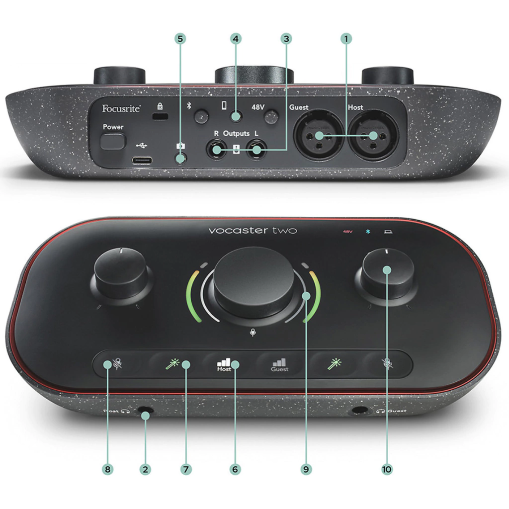 Conecte Vocaster ao seu computador por meio de USB-C para gravar no software de gravação de sua escolha e acesse o Vocaster Hub para personalizar seu som. Vocaster Two é perfeito para um podcast de duas pessoas. Basta usar as entradas XLR Host e Guest para os microfones e conectar os fones de ouvido à saída Host e Guest na parte frontal da interface para evitar qualquer feedback ou eco.