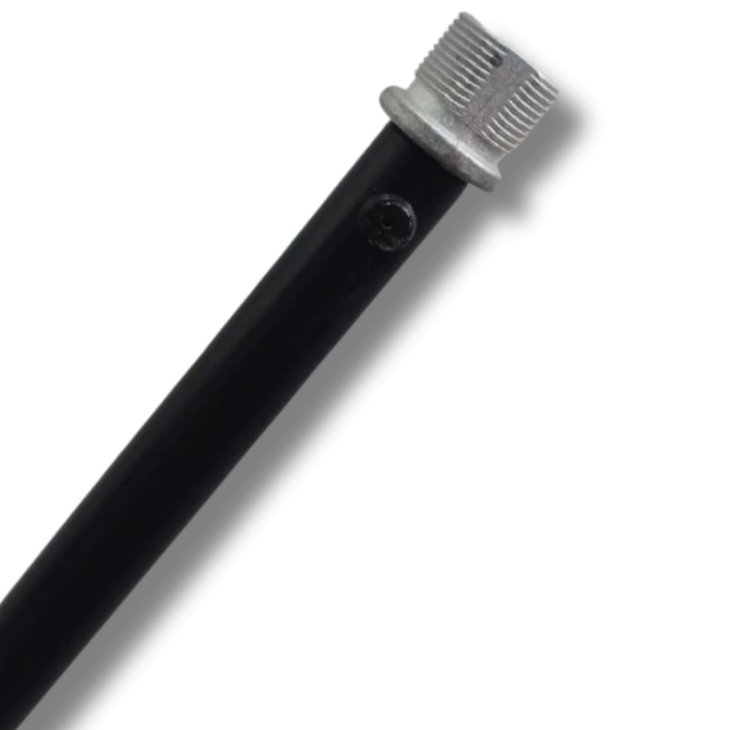 Pedestal para um microfone. Sistema de ajuste da inclinação da haste com parafuso "tipo" morsa, ajuste de comprimento da haste com manípulo de aperto, sistema de trava rápida, tripé antiderrapante retrátil e pintura eletrostática. Fabricado com tubos de aço, peças de plástico injetado de alta resistencia nas juntas e articulações