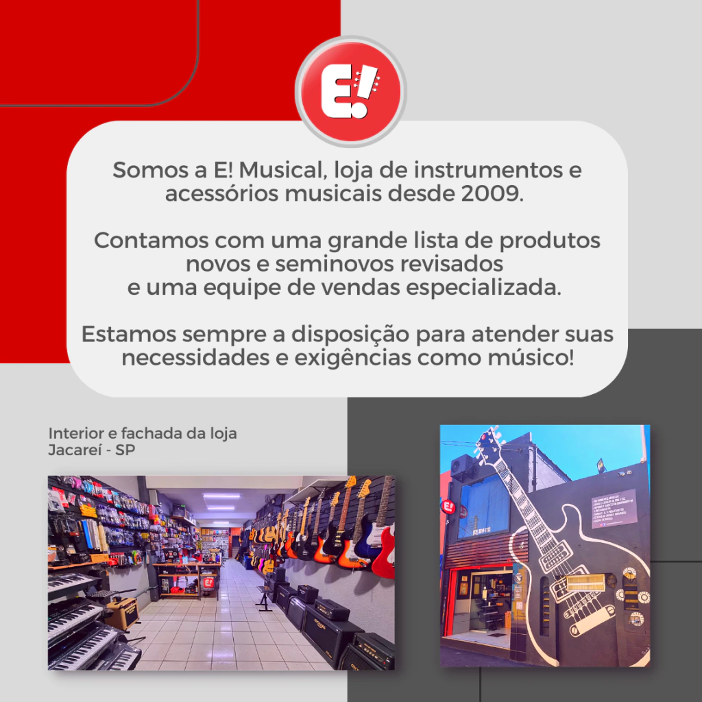 Somos a E! Musical loja de instrumentos e acessórios musicais. Contamos com uma vasta gama de produtos novos e seminovos revisados, uma equipe de vendas especializada que trabalha desde 2009 no mercado da música. Estamos sempre à disposição para atender suas necessidades e exigências como músico!