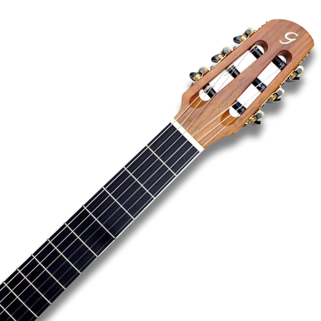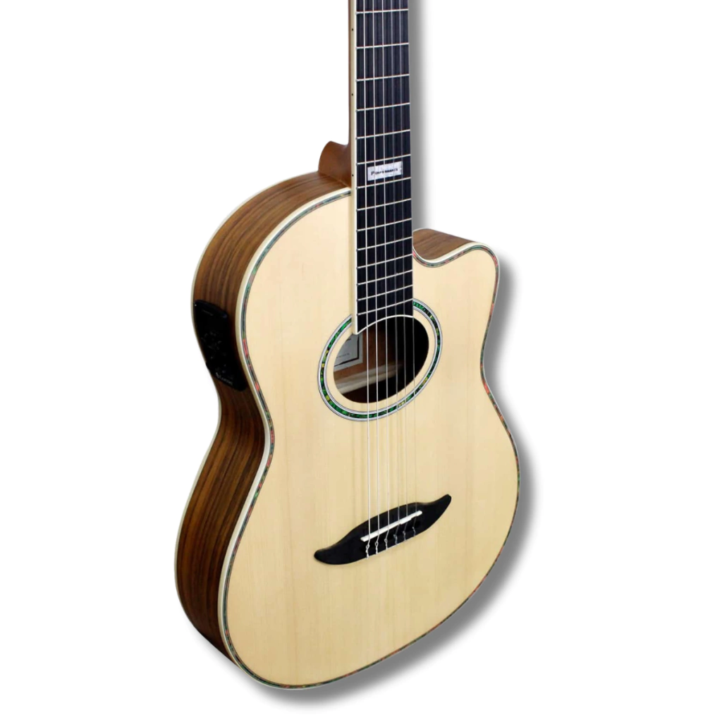 Violão flat cutaway nylon - tampo em spruce, faixa e fundo em ovangkol, escala em rosewood, tarraxas pino grosso dourada, 3+3 com botões plásticos pretos, braço em okoume. - equalizador 3 bandas com afinador cromático. - controles: middle, tuner, treble, bass, phase e volume.- acabamento: verniz fosco. Cor: natural satin (ns)